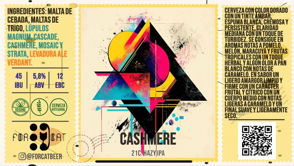 Ingredientes: Malta de Cebada, Maltas de trigo, lúpulos (Magnum, Cascade, Cashmere, Mosaic, Strata), levadura Ale (Verdant).